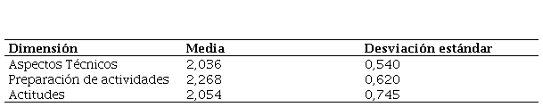 La media de las respuestas a los enunciados del instrumento se ubicó claramente en la opción A veces, con una desviación estándar no muy distante de la media. Se pudo establecer que las percepciones de los estudiantes se encontraban en un estado de poca solidez frente a los enunciados. Los resultados por cada dimensión del instrumento en la tabla 2 fueron los siguientes: