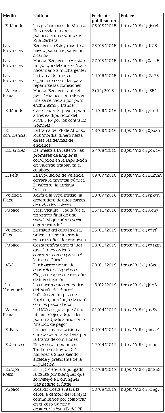 La metodología de esta investigación se basa en la búsqueda documental sistemática, la revisión de la literatura y el análisis de las experiencias relacionadas con el estudio de caso. Con esta meta, se han analizado las principales noticias de la hemeroteca (Cuadro 1) sobre el caso Taula con el objetivo de interpretar y reconstruir los hechos acaecidos en esta trama de corrupción.