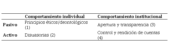 Por último, las políticas de control y de rendición de cuentas (4) constituyen arreglos institucionales coercitivos activos que se aplican a toda la estructura de la institución. El punto de partida es que la moral de los individuos, debido a factores culturales, institucionales o sociales es relativa y que, en consecuencia, se necesitan herramientas que sean iguales para toda la institución y controlen las posibles conductas que desvíen recursos públicos a la esfera privada de forma ilícita.