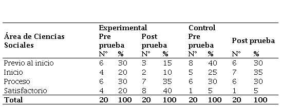 En la tabla 1 se aprecia que el nivel que predomina en ambos grupos es el de previo al inicio es decir calificativos inferiores a ocho en una escala vigesimal. Significa que los escolares que se encuentran en este nivel no logran las destrezas y habilidades requeridas para estar en la categoría de inicio. Evidenciando las pocas oportunidades de aprendizaje que han tenido hasta este momento, observándose que antes de aplicar el “Modelo de aprendizaje con perspectiva didáctica contextual” los escolares del equipo experimental y control presentan deficiencias en el logro de las competencias surgiendo la necesidad de innovar las prácticas pedagógicas y didácticas en el área. De igual forma se aprecia que en el post prueba el 60% de los escolares del equipo experimental logran mejores niveles de desempeño ascendiendo a niveles de proceso y satisfactorio respectivamente; comprobándose que al experimentar y después de aplicar el “Modelo de aprendizaje con perspectiva didáctica contextual”. Los resultados son positivos en los escolares del equipo experimental, evidencian mayores desempeños en la escala de logro a diferencia de los educandos del grupo control cuyos avances son mínimos.