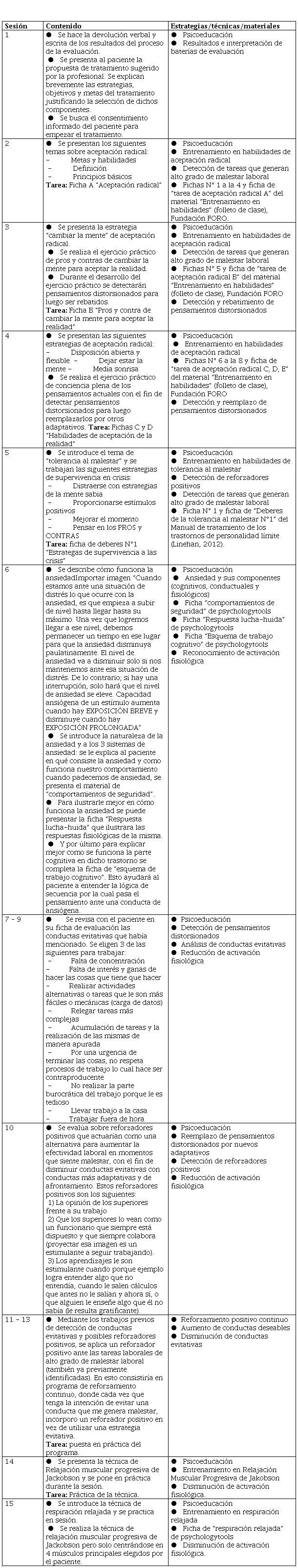 Finalmente se elabora una propuesta de tratamiento hecho a medida con evidencia científica, que consta de 15 sesiones que abarca el entrenamiento en habilidades de tolerancia al malestar (aceptación radical), la reestructuración cognitiva, el reforzamiento positivo continuo y el entrenamiento en relajación.