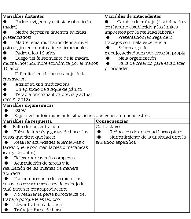 A continuación, se hará un análisis y descripción del conjunto de problemas basado en la dimensión cognitiva, conductual y fisiológica, representado a través de un mapa conceptual del análisis funcional del caso (Figura 1 y Tablas 1 y 2).
