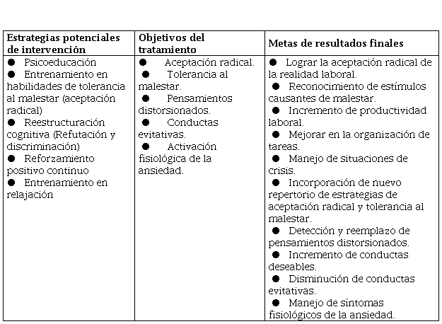 Teniendo en cuenta que las conductas objeto de intervención son la aceptación radical, la tolerancia al malestar, los pensamientos distorsionados, las conductas evitativas y la activación fisiológica de síntomas ansiógenos; se presentan los siguientes objetivos para alcanzar las metas propuestas en el diagrama expuesto más arriba.