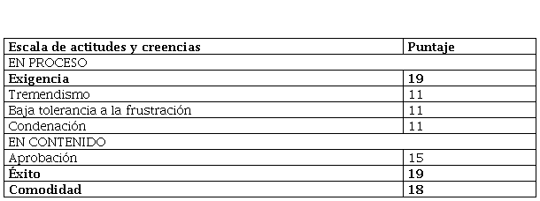En los resultados de la Escala de Actitudes y Creencias (Tabla 4), podemos observar que, a nivel de contenido, las manifestaciones de irracionalidad se basan en la idea “éxito” (19 puntos) y “comodidad” (18 puntos). En cuanto a las inferencias y procesos secundarios, el nivel de proceso con mayor puntaje es el de “exigencia” (19 puntos).