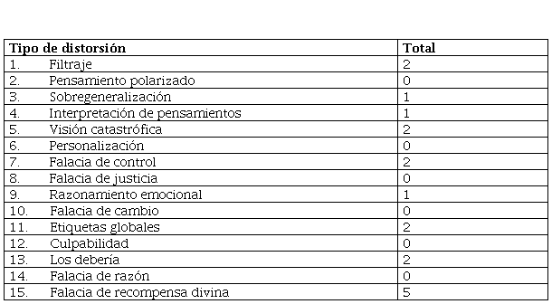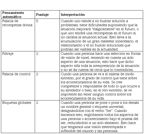 En la aplicación del Inventario de Pensamientos Automáticos (Tablas 5 y 6) el paciente obtuvo un puntaje elevado en 1) falacia de recompensa divina (5 puntos), 2) filtraje (2 puntos), 3) falacia de control (2 puntos) y 4) etiquetas globales (2 puntos).