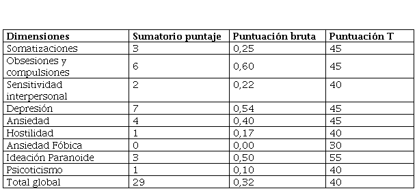 Datos obtenidos del Inventario de Síntomas SCL-90-R (Tabla 7) confirman que el paciente no presenta patologías (puntuación T40).