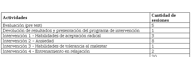 Para la elaboración de las estrategias, técnicas y materiales a utilizar se establecen contenidos por cada sesión. Los contenidos son Habilidades de aceptación radical, Ansiedad, Habilidades de tolerancia al malestar y Entrenamiento en relajación.