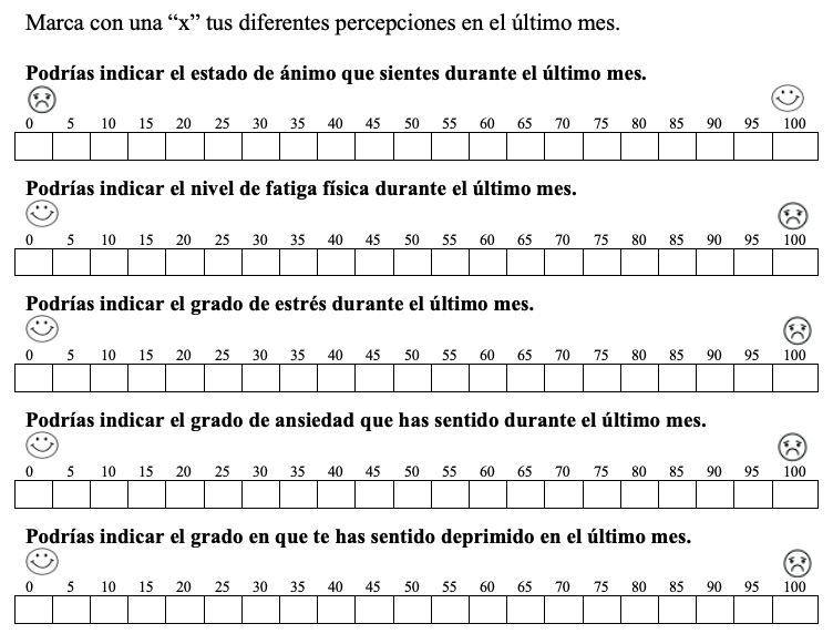 A partir de cinco escalas, de elaboración propia, se midió la percepción de los participantes sobre su estado de ánimo, su nivel de fatiga física y el grado en que se habían sentido estresados, deprimidos o con ansiedad durante el último mes. Para su cumplimentación, se debía puntuar de 0 a 100 con una “x”. En cada uno de los extremos de las escalas, se acompaña un emoticono con dos caras (feliz y triste) para ayudar a todos los participantes en la clarificación de sus respuestas (Figura 1).