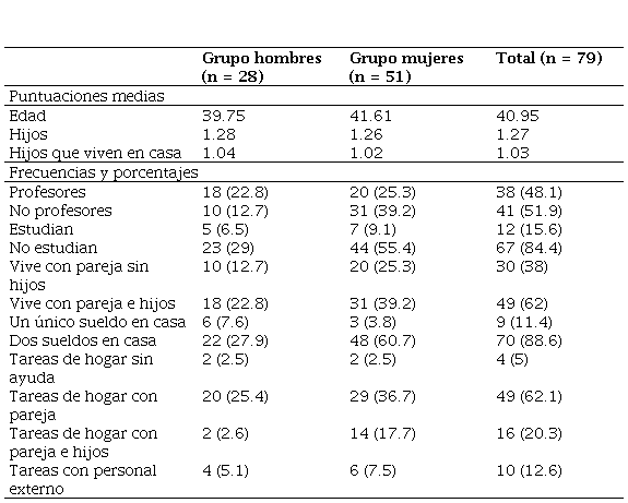 El presente estudio se ha llevado a cabo con las respuestas de 79 participantes heterosexuales que viven con su pareja. Todos ellos tienen un trabajo remunerado y desempeñan sus funciones a jornada completa. De ese número total, 38 son docentes no universitarios de centros públicos (48.1%) y los otros 41 (51.9%) trabajan en profesiones distintas a la docencia. Por sexos, la muestra total se compone de 28 hombres (35.4%) y 51 mujeres (64.6%). El grupo de no profesores, desempeña sus funciones dentro de profesiones del sector servicios, con el fin de establecer un grupo control con características similares a las de los docentes. Por este motivo, se ha determinado como criterio de exclusión el desarrollo de las funciones laborales en los sectores primario y/o secundario ya que los niveles de carga física que se dan en estos sectores son mucho más elevados. Además, los empleados del sector terciario comparten con la docencia la necesidad de relacionarse, de manera presencial o telemática, con otras personas a lo largo de su jornada laboral. Un segundo criterio de exclusión, tiene que ver con la edad mínima de los participantes. En este caso, se han excluido aquellos hombres o aquellas mujeres que pese tener un trabajo remunerado en el sector servicios no habían cumplido los 18 años. Un tercer criterio de exclusión está relacionado con las personas que conviven en el domicilio. Se han excluido los participantes que viven solos, con amigos y en casa de los padres ya que los investigadores del estudio han considerado que no podía haber división de las tareas por género y el sustento principal correspondía a sus progenitores. En cuarto y último lugar, se ha excluido al profesorado que desarrollaba sus funciones en la etapa universitaria. En la tabla 1 se pueden observar algunos aspectos sociodemográficos, así como la distribución de hombres y mujeres en función de los grupos establecidos.