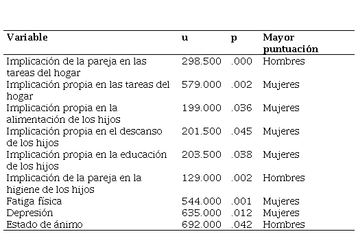 Los análisis preliminares de normalidad mostraron una distribución no normal en las variables estudiadas: percepción de implicación propia y de la pareja en las tareas del hogar, implicación propia y de la pareja en el cuidado de los hijos y en las variables estado de ánimo, fatiga, estrés, ansiedad y depresión. A partir de estos resultados iniciales se emplea la prueba U Mann-Whitney (no paramétrica).