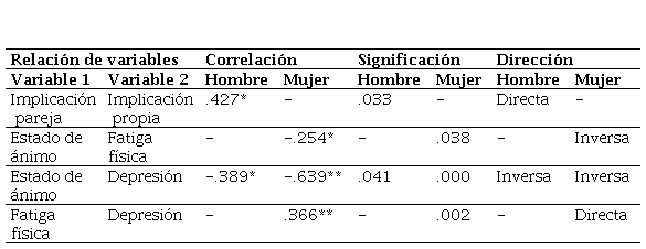 Para dar respuesta al objetivo número tres se llevan a cabo las correlaciones de Spearman. La tabla 3 muestra como existen diferencias significativas tanto en hombres como en mujeres. Concretamente, en el grupo de hombres, la variable implicación de la pareja correlacionó de manera directa con la variable implicación propia (p=.033). Otra relación de variables, en este caso inversa, que se da entre los hombres se detecta en las variables estado de ánimo y depresión (p=.041). En el caso de las mujeres estas dos variables, estado de ánimo y depresión, también correlacionan de manera inversa, pero de una manera mucho más consistente (p= .000). Siguiendo con las mujeres se observa como la fatiga física se relaciona de manera directa con la depresión (p=.002) y el estado de ánimo con la fatiga física de manera inversa (p= .038).