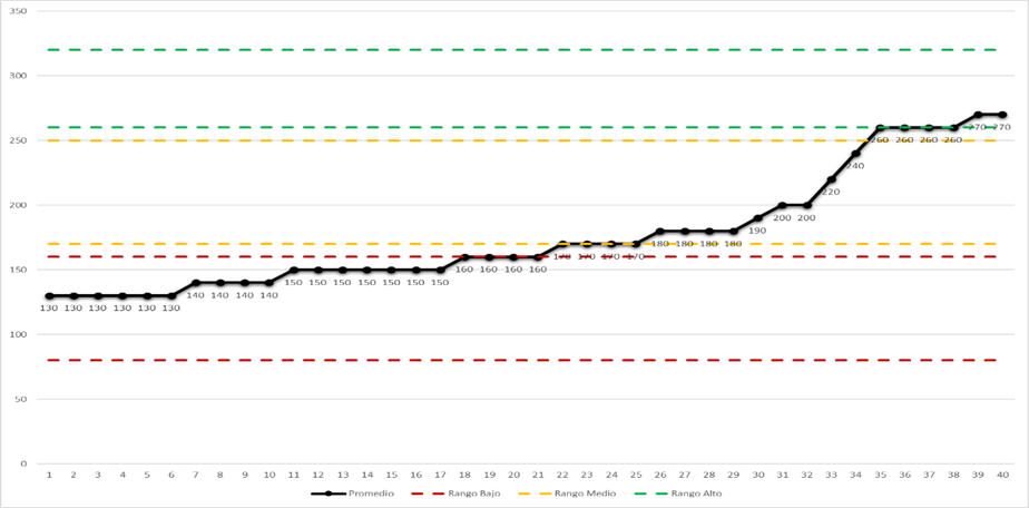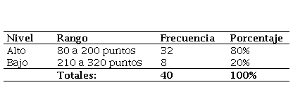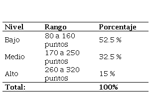 Bajo esta lógica se establece que la puntuación mínima a alcanzar por el encuestado es de 80 puntos, y una puntuación máxima de 320 puntos.