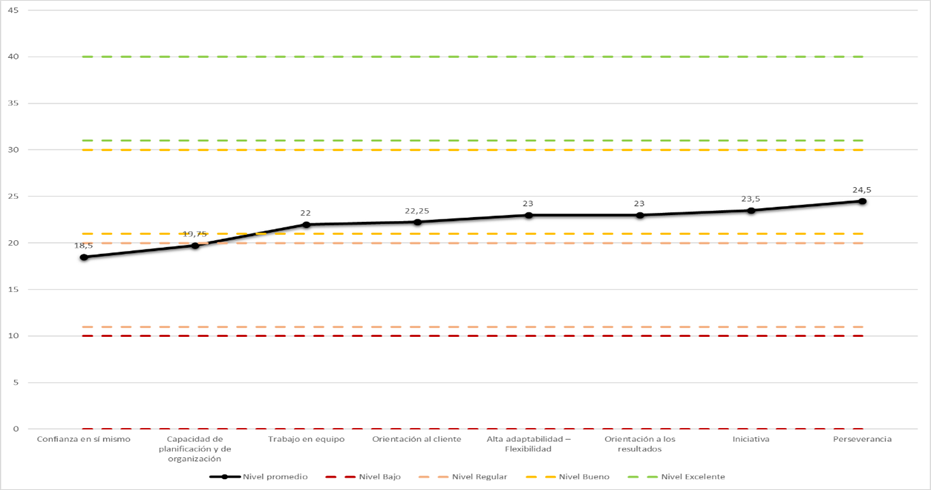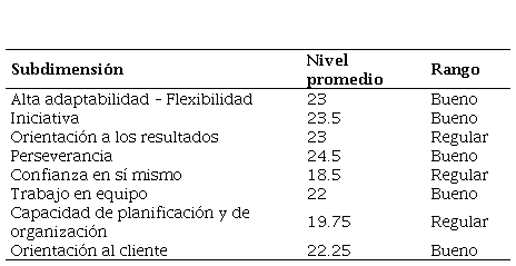 Los resultados obtenidos en cuanto al nivel de competencias laborales por subdimensión establecieron que las subdimensiones de alta adaptabilidad-flexibilidad, iniciativa, confianza en sí mismo, trabajo en equipo, perseverancia y orientación al cliente, obtuvieron una calificación de bueno, y que, en el caso de la capacidad de planificación y organización, y orientación a resultados, obtuvieron una calificación regular.