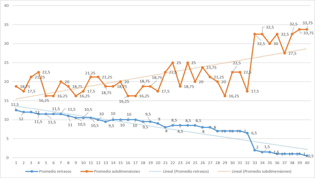 Para validar si existe una relación directa entre la competencia laboral y el efecto relajación, se realizó un análisis comparativo de la calificación promedio obtenida de las subdimensiones de competencias laborales de los 40 trabajadores, contra el número de retrasos promedio que tuvieron en 3 proyectos de forma individual, para tal efecto, se dispuso ordenar a todos los trabajadores en relación de menor a mayor promedio obtenido en la subdimensión de competencia laboral. Tal como se aprecia en la figura 4.