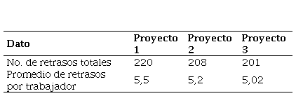 A nivel general, los trabajadores tuvieron 5 retrasos en promedio, que contemplando los 40 trabajadores hicieron más de 200 retrasos en los últimos 3 proyectos atendidos.