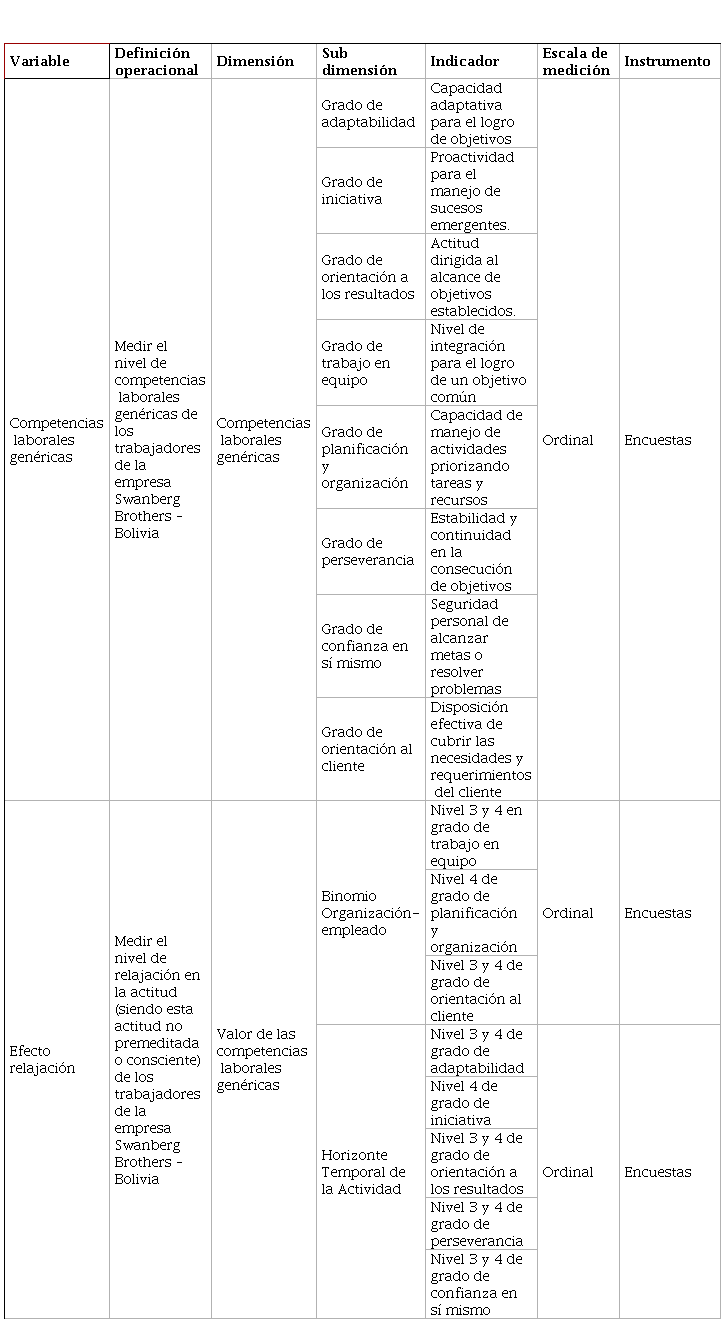 El estudio estableció que el personal operativo de la empresa Swanberg Brothers – Bolivia presenta un problema de retraso en las tareas de forma individual que repercute directamente en los proyectos que lleva a cabo la empresa. Estos retrasos, originado por efecto relajación, tienen a su vez, una relación directa con las competencias laborales de los mismos trabajadores.