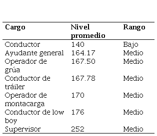 Si bien, solo la categoría de Conductor fue la única que obtuvo un nivel bajo, las categorías de conductor de tráiler, ayudante en general y operador de grúa, apenas pasaron el margen de los 160 puntos de nivel medio, por lo que podría establecerse como los cargos en los cuales trabajar en primera instancia, ya que, sumando los trabajadores de estos 4 cargos, suman un total de 28 trabajadores del área operativa.