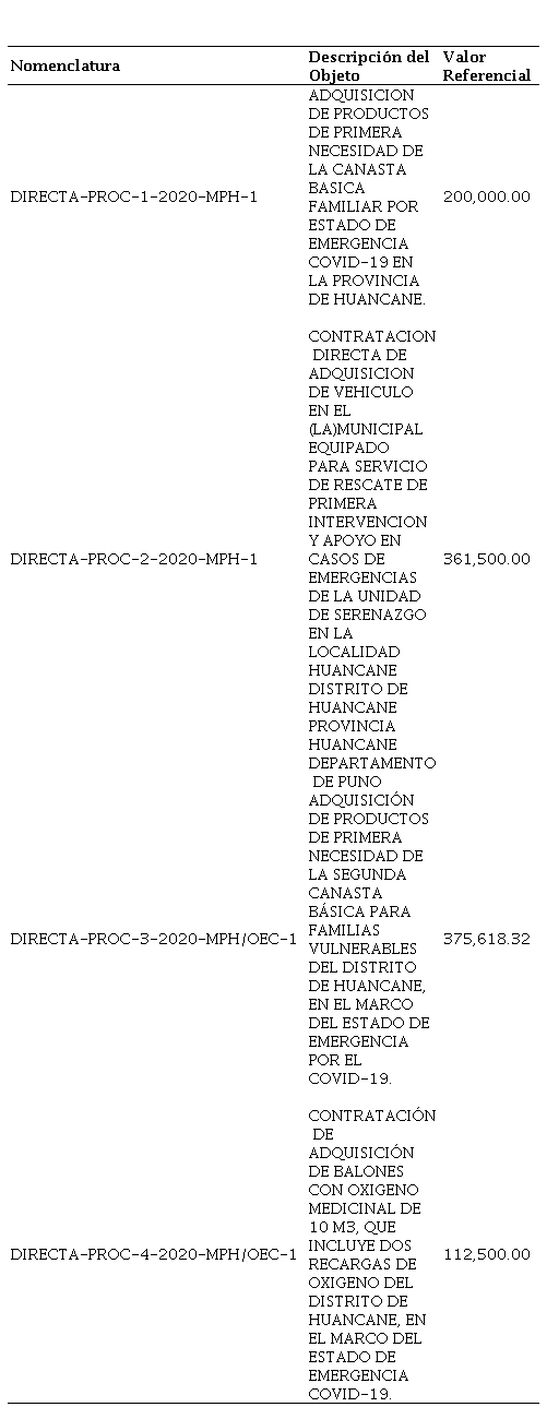 Por ello, la Municipalidad Provincial de Huancané según el portal del SEACE en el año 2020, solo realizó 04 procesos de contratación directa, de los cuales 01 proceso culminó oportunamente, 01 proceso presenta serias irregularidades que conllevaron a que se resuelve el contrato y 02 procesos evidenciaron demoras considerables en su ejecución. Estas situaciones generan malestar, preocupación e indignación en la población huancaneña para con sus autoridades municipales y todo su equipo técnico; en relación al manejo del presupuesto público, transparencia de los procesos, criterios para focalizar a personas vulnerables y criterios para invitar a un proveedor determinado.