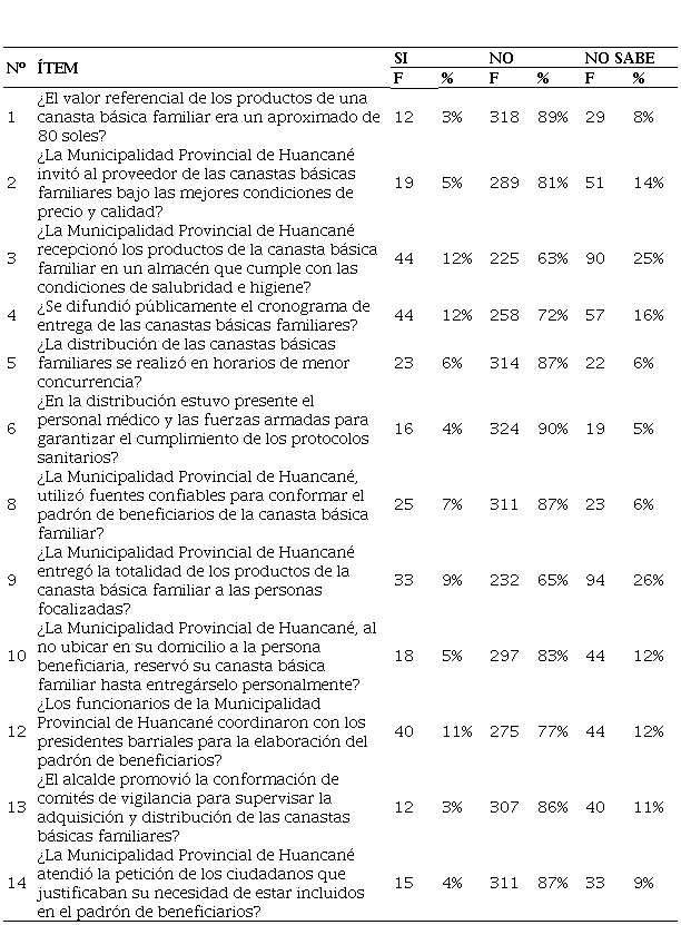 En la misma línea, los encuestados respondieron que la Municipalidad Provincial de Huancané no difundió públicamente el cronograma de entrega de las canastas básicas familiares, la entrega no se realizó en horarios de menor concurrencia y no estuvieron presentes las fuerzas armadas y/o personal médico, lo que evidencia que el proceso de distribución de las canastas no fue eficiente, resultados que difieren de lo obtenido por Ushiñahua (2020), porque en su investigación concluye que en el proceso de distribución de las canastas básicas familiares en la Municipalidad Provincial de Lamas, predomina el nivel regular con un 44% de aceptación, lo que significa que la distribución fue desarrollada adecuadamente por los servidores y/o funcionarios de esa municipalidad.