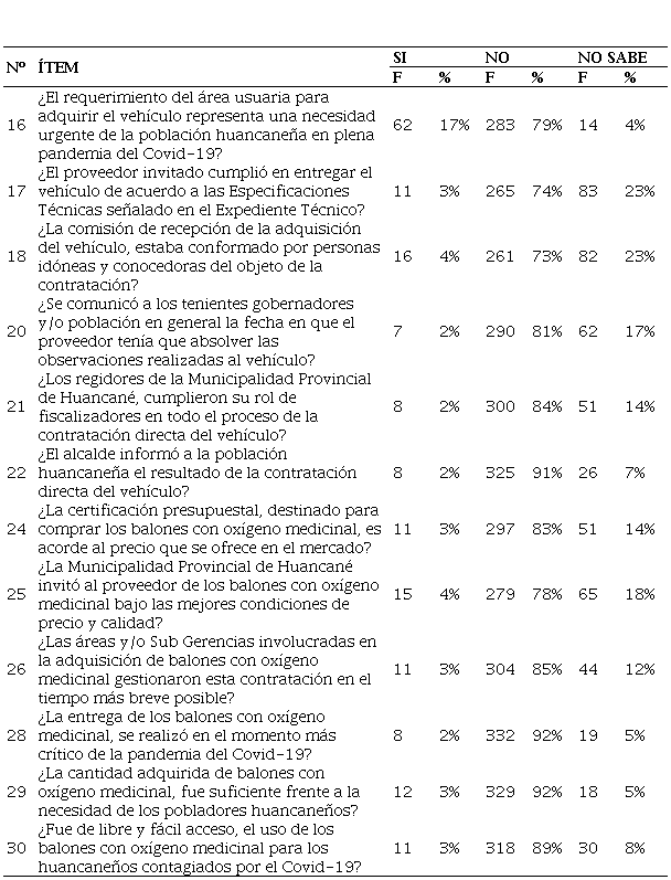 Resultado que evidencia que el cuestionario aplicado a las 359 personas de la población urbana del distrito y provincia de Huancané, se ubica entre los valores de 0.81 a 1.00, lo cual es altamente confiable, según la interpretación hecha por Gamarra et al., (2015). Este cuestionario ha sido relacionado y enfocado en las contrataciones directas realizadas por la Municipalidad Provincial de Huancané en el año 2020, detallado en la tabla 2.