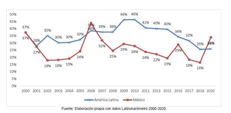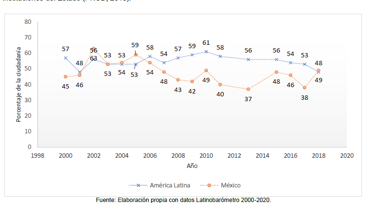 En América Latina -y específicamente en México- la percepción hacia la democracia sigue con una tendencia a la baja. La confianza de diversos sectores poblacionales respecto a las instituciones democráticas va en descenso y ha provocado que se encuentren vías distintas a las tradicionales para participar políticamente. El Latinobarómetro ha registrado cifras sumamente interesantes al respecto desde el año 2000 y hasta la fecha hay dos tendencias que merecen la pena ser mencionadas. La primera, respecto a si un gobierno democrático es deseable frente a uno autoritario: mientras que el promedio de la geozona presenta una mayor predilección hacia la democracia (lo cual también es preocupante pues ha ido a la baja), en México es notorio el bajo apoyo existente hacia la democracia (Figura 1).