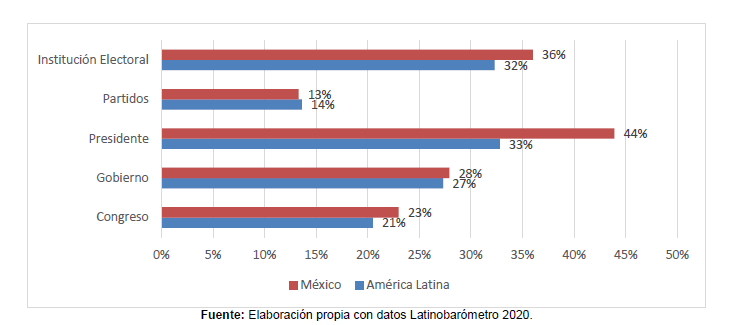 Sin embargo, en contextos de corrupción, impunidad y alta desigualdad social o económica, es posible que la confianza ciudadana en las instituciones decrezca a pesar de la existencia de mecanismos institucionales que garanticen la transparencia y la rendición de cuentas. De hecho, México en 2020, se encuentra por encima de la media de confianza en las instituciones democráticas en América Latina. Sin embargo, no hay que perder de vista que la confianza en ningún caso supera el 50% de la ciudadanía, lo cual es un indicador preciso de la necesidad de transitar a un mayor empoderamiento ciudadano a través de mecanismos alternativos de participación (Figura 3).