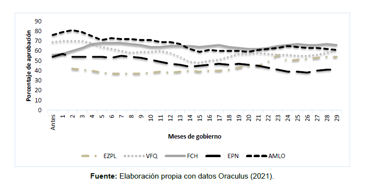 Desde que Andrés Manuel López Obrador asumió el cargo en diciembre de 2018, ha mantenido de manera consistente altos índices de aprobación ciudadana. Después del resultado que obtuvo en la elección presidencial de 2018 (53% de votación), algunas casas encuestadoras se han dado a la tarea de medir su popularidad de forma regular, una vez que asumió el gobierno. Por principio, cabe destacar que después de 29 meses de gestión gubernamental, los niveles de aceptación del presidente no difieren mucho respecto de sus últimos cuatro antecesores en el mismo periodo de tiempo (Figura 4). En segundo lugar, debe considerarse que aunque durante los primeros meses de su gobierno llegó a alcanzar una aceptación del 81% entre la ciudadanía, los niveles de confianza hacia su figura cayeron aproximadamente 20 puntos porcentuales, colocándose incluso por debajo de los niveles de preferencia que llegó a tener el expresidente Felipe Calderón después de 29 meses de gobierno.[4]