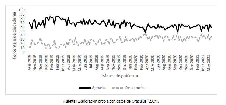 La aprobación presidencial después de dos años y medio de gobierno mostró que seis de cada diez ciudadanos mexicanos otorgan su apoyo a la figura del titular del ejecutivo (Figura 5). A pesar de la caída en la aprobación presidencial y, considerando que se han presentado variaciones en este periodo de tiempo, una constante es que más de la mitad de los encuestados apoyan al presidente Andrés Manuel López Obrador. En caso de mantenerse constante esta tendencia durante los siguientes meses puede considerarse que el actual mandatario obtendría el apoyo mayoritario de la ciudadanía en la consulta relacionada con la revocación del mandato hacia marzo de 2022, dado que hasta el momento no ha caído más allá del 45% en su aprobación. No obstante, debe considerarse que estos índices que actualmente le favorecen podrían revertirse si se presentaran coyunturas políticas o económicas que pudieran afectar considerablemente su popularidad.