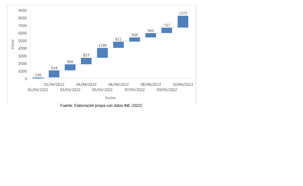 Es muy importante mencionar que el sistema de votación estuvo abierto para la ciudadanía desde el 1° de abril y hasta el 10 de abril (día en que al cerrar el sistema, se realizó el escrutinio y cómputo). El comportamiento de la votación puede expresarse en la figura 6.