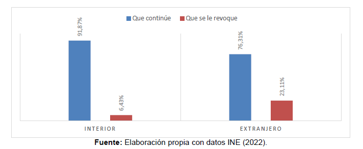 De manera muy similar a lo que sucedió en el interior del país, la ciudadanía residente en el extranjero que participó, votó en su mayoría que el presidente electo terminara su periodo de mandato. Merece la pena realizar una comparación gráfica para que las y los lectores de Voz y Voto, tengan la oportunidad de comparar los resultados al interior y al exterior del país, pues desde el extranjero se mostró una mayor participación porcentual por la opción “que se le revoque el mandato” (Figura 7).