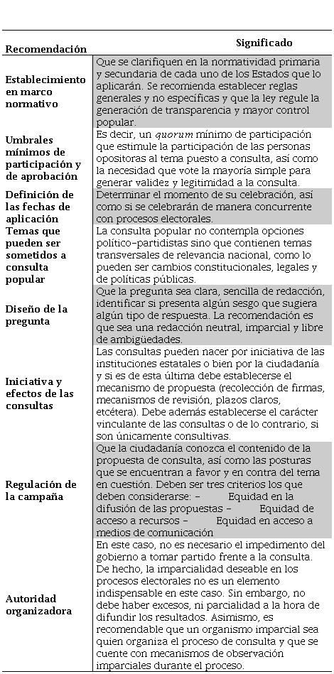 Tabla 1.Recomendaciones internacionales para la aplicación de mecanismos de democracia directa.