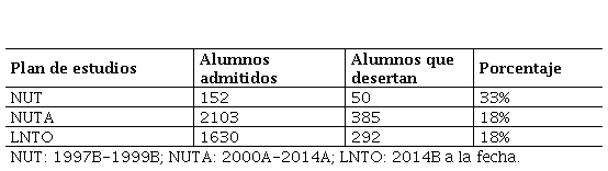 Con base al registro del estatus por generación de ingreso de la LN se identificó para el primer plan de estudios (NUT), un total de 50 alumnos con estatus de deserción de 152 alumnos matriculados, equivalente al 33 %, siendo la generación 1999B la de mayor porcentaje de deserción (45 %). Para el segundo plan de estudios (NUTA) la deserción es de 18 % (385 de 2,103 alumnos matriculados), destacando que en la generación ingreso 2001A se alcanzó hasta 38 % de deserción. Por último, para el plan de estudios actual (LNTO), al momento del análisis (2021), se registran 292 desertores de 1,630 alumnos matriculados lo que equivale también al 18 % (Tabla 1); sin embargo, de ellos, 108 estudiantes se encuentran con posibilidades de retomar sus estudios por lo que la deserción real sería de 11 % (n=108). A pesar de esto, llama la atención que en la generación ingreso 2014B la deserción alcanzó el 31 %, esta generación se caracteriza por ser la primera generación del plan de estudios más reciente, en la cual también hubo un aumento del número de alumnos admitidos que pasó de 90 a 120 alumnos por generación.