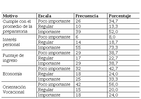 Se identifica que para los alumnos desertores los principales motivos de elección de la carrera, que fueron valorados como “importantes” son el interés o motivos personales (73.3 %), tener el promedio necesario del nivel bachillerato (52 %) y el puntaje de ingreso con 38.7 %. Mientras que la orientación vocacional y los factores económicos, los consideraron “poco importantes” con un 56 % y 42.7 % respectivamente (Tabla 2). Sin embargo, de los sujetos encuestados, 28 % (n=21) respondieron que su primera opción de elección era otra carrera, principalmente medicina (n=8) y psicología (n=2), así como arquitectura, derecho, diseño, música, ingeniería, administración, entre otras.