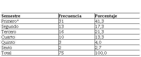 En la tabla 3 se muestra la frecuencia de deserción por ciclos escolares cursados, al respecto, el 41.3 % (n=31) de los estudiantes que desertaron cursaron solo el primer semestre, 17.3 % segundo, 21 % tercero y 13.3 % hasta cuarto semestre. Por lo que el 58.6 % (n=44) de la deserción escolar se presenta en el primer año de la licenciatura y 93.3 % en el segundo año.
