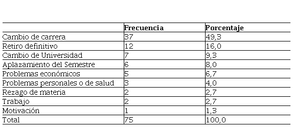 El motivo principal por el que decidieron desertar los sujetos encuestados fue el cambio a otra carrera en 49.3 % (n=37) de los casos, a éste, se suma 16.0 % que solicita un retiro definitivo de sus documentos sin especificar la causa, seguido del 9.3 % que desertaron por un cambio de universidad. Estos últimos probablemente se mantengan en la misma licenciatura, pero motivos personales como el cambio de residencia, deciden irse a otra institución educativa. Otros motivos elegidos para desertar son los problemas económicos, de salud, trabajo, rezago de materias y falta de motivación (Tabla 4).