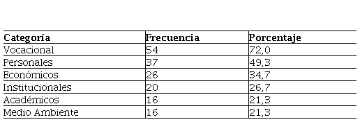 Con respecto a las categorías de motivos de deserción generadas a partir de los 22 factores o motivos de deserción (Tabla 5), se ratifica que el mayor porcentaje de deserciones se debe a “motivos vocacionales” ya que 72.0 % mencionó los aspectos agrupados en dicha categoría.