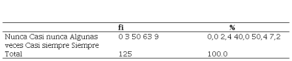 Según los resultados, luego de la aplicación del instrumento, el 50, 4% de estudiantes casi siempre presenta pensamiento crítico, el 40% algunas veces, el 7,2% siempre lo presenta, mientras que el 2,4% casi nunca. Este resultado indica que los estudiantes logran un nivel aceptable de pensamiento crítico (57,6%) con tendencia a subir, porque algunos estudiantes lo logran algunas veces (Tabla 1).