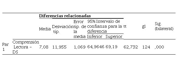 Tabla 3. Prueba de muestras relacionadas para la comprensión lectora y la dimensión sustantiva del pensamiento crítico.
