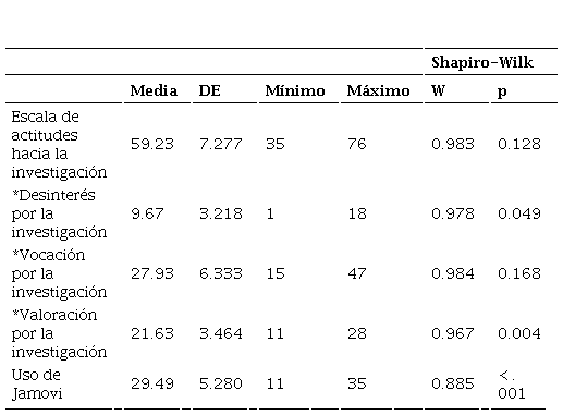 Tabla 2. Estadísticos Descriptivos de la Escala de actitudes hacia la investigación y uso del Jamovi.
