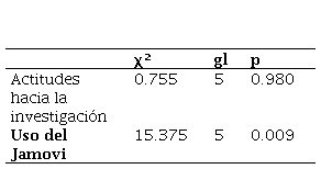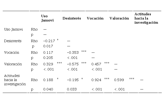 En la tabla 3 se puede observar la matriz de correlación que indica una relación positiva estadísticamente significativa con intensidad leve entre el uso de Jamovi y la escala total de actitudes hacia la investigación (rho=0.188*); también hay correlación positiva con valoración por la investigación (rho=0.329*) mientras más estimación tengo sobre el uso de Jamovi también se correlaciona con la visión positiva hacia la investigación. Finalmente hay una relación inversa con la dimensión de desinterés (rho=-0.217*) es decir mientras más importante es el uso del Jamovi menos desinterés por la investigación van a presentar los estudiantes universitarios.