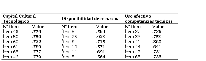 En el factor Capital cultural tecnológico, sus indicadores resultaron ser cinco: Ítem46, Ítem 50, Ítem 60, Ítem 61 e Ítem 68, los cuales obtuvieron pesos de regresión 0.614; 3.842; 2.002; 1.443 y 1.00 respectivamente, lo que se considera como buenos indicadores del constructo. Buscar y descargar música por Internet; leer prensa, revistas o libros por Internet; buscar por Internet artículos científicos o hacer las tareas con apoyo de la red.