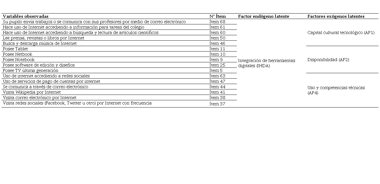 Como se ha dicho, esta investigación contempló cuatro variables o factores latentes exógenos (constructos) para la integración de herramientas digitales en la sala de clases: Capital cultural tecnológico, Disponibilidad de recursos TIC, Importancia y uso de Internet, y Uso y competencias tecnológicas. Todos estos constructos se precisan a continuación.