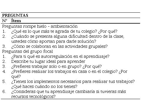 Los instrumentos de recolección de información fueron aplicados en el mes de marzo del año 2022 (el estudio contó con un año de duración) distribuidos en un grupo focal para los estudiantes de educación básica secundaria y media; por su parte, la entrevista semiestructurada se aplicó a todos los docentes y a los padres de familia a padres de familia de los estudiantes de grado transición y 1°. Esto último se debe a que, por la etapa de desarrollo en la que se encuentran los niños y las niñas, se les hace difícil responder al grupo focal con preguntas teóricas y prácticas relacionadas con la autorregulación del aprendizaje.