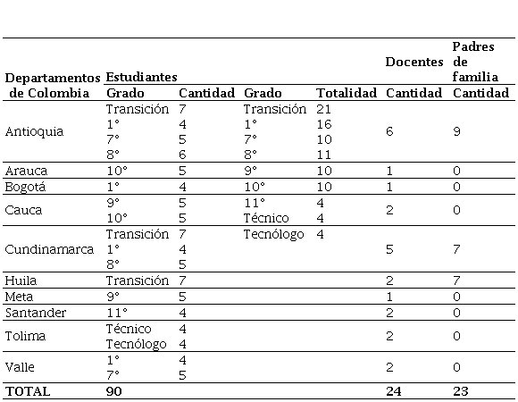 La población correspondió a estudiantes, docentes y padres de familia de instituciones educativas del sector público y privado, rural y urbano, de las jornadas de la mañana, tarde, nocturna y única, distribuidos en 9 departamentos del país tales como Garzón (Huila), Fortul (Arauca), Bucaramanga (Santander), Bogotá, Tenjo, Guayabal de Siquima (Cundinamarca), Urabá, Medellín, Rionegro (Antioquia),Ibagué (Tolima), Granada (Meta), Santiago de Cali (Valle del Cauca) y Almaguer (Cauca), donde se ofrecen niveles de educación en preescolar, básica primaria, básica secundaria, tecnológico y técnico. Por medio de un muestreo no probabilístico intencionado (Hernández-Sampieri & Mendoza, 2023; Avendaño, 2020) se establece una muestra de 137 participantes distribuidos en, 90 estudiantes heterogéneos (52 estudiantes masculinos y 68 femeninas de estratos socioeconómico 1, 2 y 3), 24 docentes (11 mujeres y 13 hombres de estratos 1, 2, 3 y 4 con nivel de formación universitario y posgradual) y 23 padres de familia (19 madres y 4 padres de estratos socioeconómicos 1, 2 y 3 con formación educativa primaria, secundaria, algunos universitaria y posgradual, los demás no cuentan con formación educativa (Tabla 1).