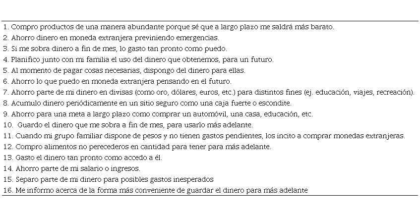 Específicamente, tres de los ítems (9, 14 y 15) proceden de la adaptación idiomática de escalas en inglés de países desarrollados, siete (1, 2 ,4, 5, 6, 7 y 11) fueron extraídos, con ligeras adaptaciones, de instrumentos abocados a contextos de pobreza, inflación y devaluación y los seis (3, 8, 10, 12, 13 y 16) restantes fueron elaborados especialmente para esta escala. Vale considerar que los ítems incluidos en los países pobres comparten grandes similitudes con los de países desarrollados, pero añaden aspectos idiosincráticos como es el ahorro en divisas extranjeras y la compra abundante de productos y alimentos como estrategia para preservar el capital (Martins & Rodríguez, 2021). La motivación para crear ítems nuevos radica en el interés por captar las particularidades de la cultura argentina. Por ejemplo, contemplando la extendida desconfianza en el sistema bancario y medios formales de resguardo del dinero se propuso un ítem que indaga la frecuencia con que se acumula dinero en un escondite (ítem 8).