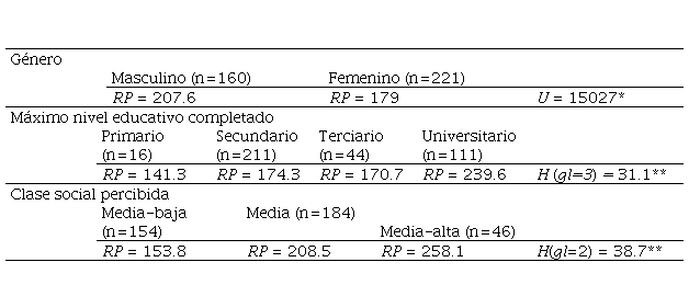 Tabla 3. Comparaciones en Escala de Ahorro según variables sociodemográficas mediante pruebas U de Mann-Whitney y de Kruskal Wallis.