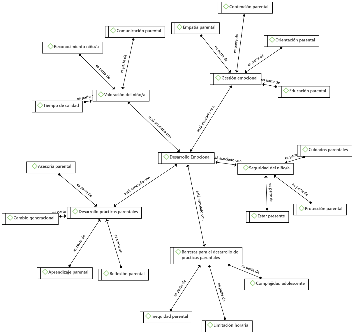 A partir del testimonio, es posible inferir que la etapa de la adolescencia a la que se aproximan los niños y niñas, es vista como algo complejo por padres y madres, pues ellos perderán una parte de la relación que tenían con sus hijos/as cuando estos eran más pequeños, y también tendrán que adaptarse a las nuevas actitudes y emociones que esta etapa trae. En suma, este conjunto de subcategorías y sus respectivos códigos permite visualizar de manera integral cómo el desarrollo emocional de los niños y niñas puede verse afectado tanto a corto como a largo plazo, especialmente cuando los padres y madres no desarrollan las competencias parentales necesarias para garantizar una crianza basada en un enfoque de parentalidad positiva, en el que el bienestar infantil sea considerado como condición esencial.