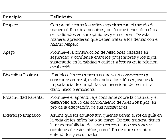 La parentalidad positiva se refiere al comportamiento de padres y madres dirigidos a un desarrollo pleno de niños y niñas que asegure su bienestar (Prime et al., 2023). Esto implica que deben ser capaces de ofrecer a sus hijos/as un empoderamiento, reconocimiento y guía en su formación, con el fin de que en el futuro puedan convertirse en personas que vivan en armonía con el mundo que les rodea y, con las demás personas que habitan en él (Council of Europe, 2006; Rivera & Martínez, 2023). Asimismo, el enfoque de parentalidad positiva, considera la imposición de límites a los hijos/as, sin la necesidad de utilizar la violencia (Council of Europe, 2006). Así, la parentalidad positiva es clave para el buen funcionamiento de las familias y para un desarrollo sano de la infancia (Servicio Nacional para la Prevención y Rehabilitación del Consumo de Drogas y Alcohol, s. f.[SENDA]). En ese sentido, el SENDA identifica cinco principios para favorecer una parentalidad positiva (Tabla 1).