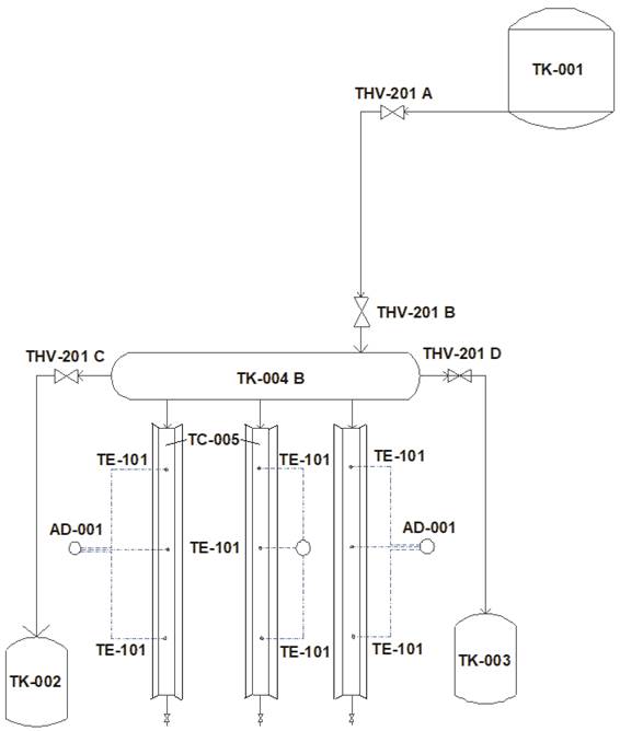 A radiant energy collection system was built based on the geometry of a CPC (Figure 1), which had a vessel for mixing water with particle suspensions (TK-001), from which a tubular distribution vessel (TK-004B) and three radiant energy collector pipes (TC-005) were fed. In order to facilitate the collection of energy, a metallic involute was installed along the length of each tube, and the distribution tube was connected to two containers for the storage of process fluid (TK-002) and steam condensate (TK-003). The temperature was recorded with type J thermocouples (TE-101) (ARPISA, Mexico) at three points inside the collector pipes and the use of a data acquisition system (AD-001). The collector pipes were positioned so that they could be rotated at angles of 30, 35, 40 and 45° in relation to the soil or the radiating source, which consisted of 500 W halogen lamps (model 9401610, ARGOS, Mexico) (Figure 2).
