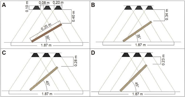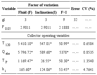 This study was carried out congruently with a 4×4 factorial arrangement, under a completely randomized design, where one of the factors was the angle of inclination of the collector system with four levels (30, 35, 40 and 45°), and the other was the process fluid with four levels (Pw, and suspension with Ac, Ci and Nc). The data of temperature reached at the time of study (Test a test ), heat absorbed (Qabs ) at test , wall temperature (TP ) and internal thermal convection coefficient (hi ) were subjected to an analysis of variance and a test to compare treatment means using Tukey's statistic (P ≤ 0.05). All analyses were performed with the SAS program (SAS Institute Inc., 1999).
